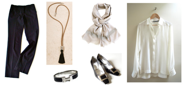 Capsule pieces: black trousers and cream silk shirt